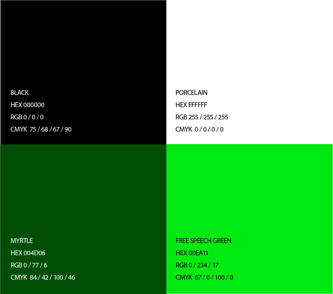 are shown in the right to be used when producing media for the respective domains. For example, when designing a sub-page on a website dedicating to Defence, the green colour will be used as the highlight and/or background color, alongside with the core Porcelain & Black. You are also free to use the tints/shades of these colors as well if required.